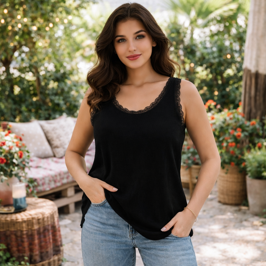 Le détail en dentelle à l’encolure et sur les bretelles apporte une touche féminine et raffinée, idéale pour porter seul ou en superposition sous une veste ou un cardigan.