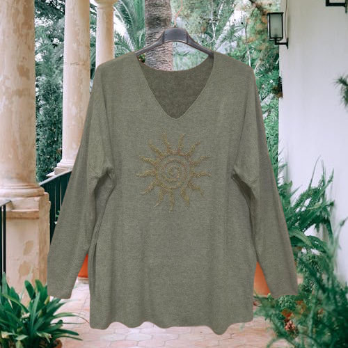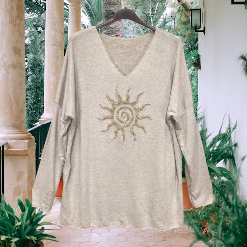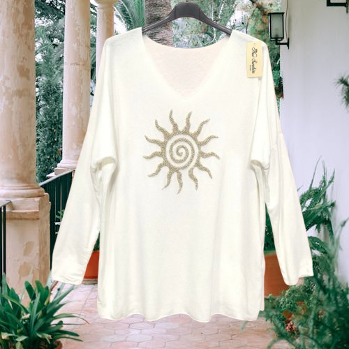 Craquez pour ce pull fin à manches longues qui allie confort et style. Sa matière ultra douce à l’intérieur vous enveloppe de chaleur et de confort, tandis que le motif soleil doré sur le devant apporte une touche lumineuse et originale à votre tenue. Fabriqué en Italie avec des matières de qualité, ce pull se porte facilement au quotidien ou pour un look chic décontracté.