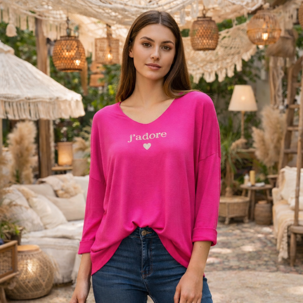 Pull fluide et confortable au coloris fuchsia vif, avec inscription « j’adore » et petit cœur sur le devant.